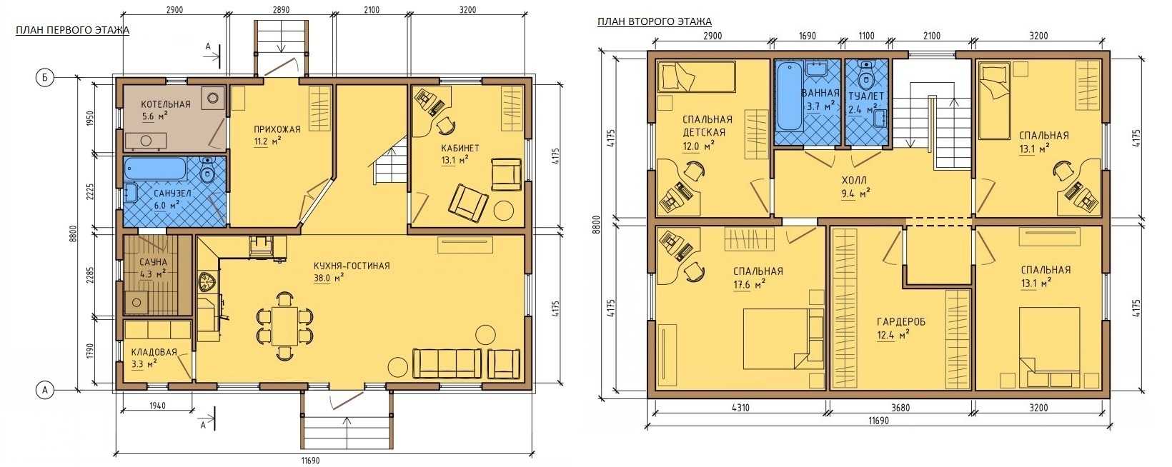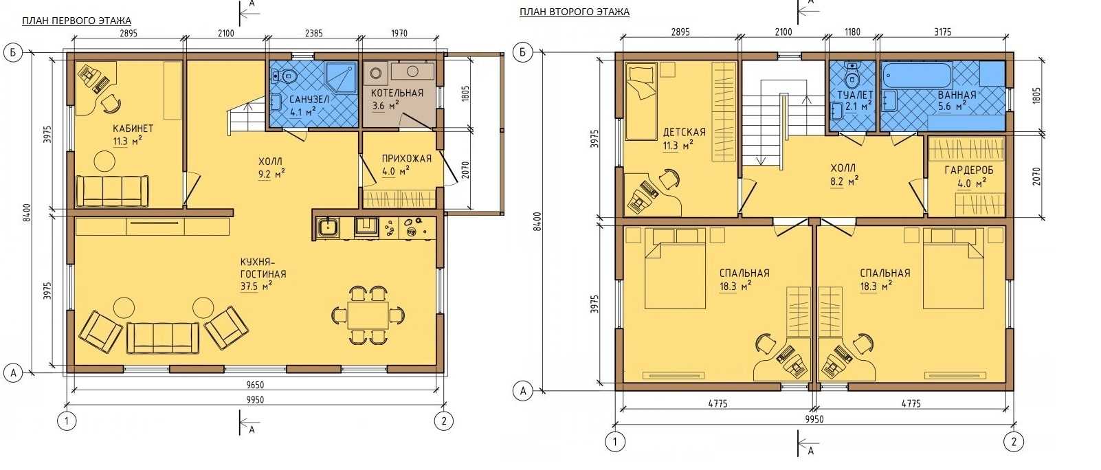 Двухэтажные дома – отличный вариант для большой семьи. Никто не будет стеснен, у каждого члена семьи своя комната, при этом зона отдыха, кухня и ванная не пострадает.
