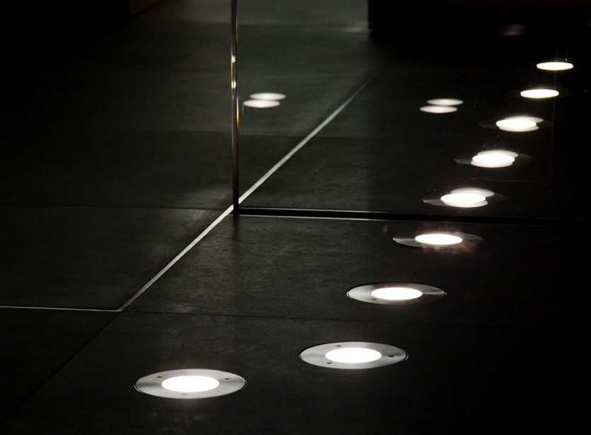 - Точечные светильники. Этот тип подойдет только там, где можно встроить оборудование в пол или нижнюю часть стен. Раньше использовались галогенные лампы, но теперь их почти не применяют, так как они сильно нагреваются и служат не очень долго. Светодиодные модели намного лучше, так как греются намного меньше, дают хороший свет и имеют ресурс работы в 20 раз больше, чем у первого типа.