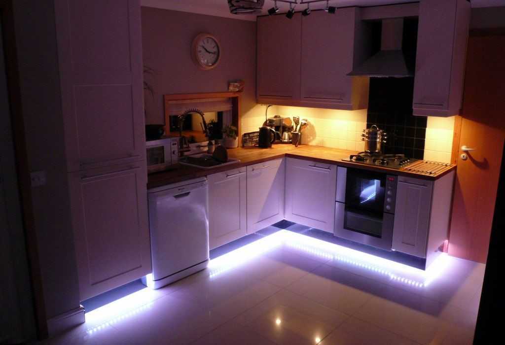 Монтаж светильников в корпус мебели, пожалуй, самый простой способ, не требующий радикальных мер. Чаще всего светильники устанавливаются в монтажную планку, которая закрывает ножки шкафов-купе или кухонного гарнитура. Преимуществом является и то, что подвести электричество в нужное место можно с помощью обычного удлинителя.