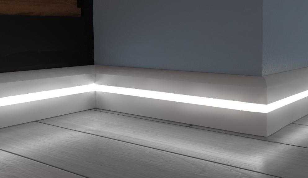 Конструкция трубки очень влагостойкая и устойчива к механическим воздействиям, гибкая, легко укладывается по периметру комнаты в качестве напольного освещения. Трубку дюралайт размещают под прозрачным матовым покрытием, в кабель-каналах плинтусов, пропускающих свет, или открытую над плинтусами.