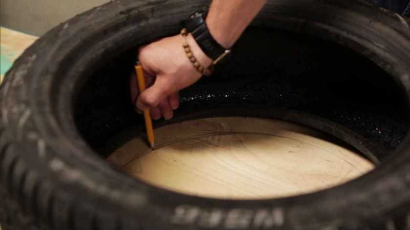 - По диаметру колеса вырезать из фанеры две круглые заготовки, приклеить их к шине с двух сторон.