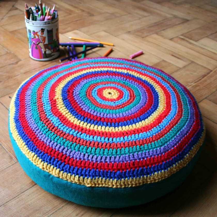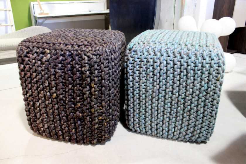 - Трикотажной пряжи. Отличается интересными дизайнами, функциональностью, экологичностью, легким весом и мобильностью. Рукодельницам потребуется всего лишь несколько часов, чтобы связать красочный чехол на пуфик. К отличительным особенностям вязаных трикотажных изделий относится: отсутствие спинки, небольшая высота и наличие мягкого наполнителя внутри. Отсутствие острых углов позволяет использовать его в детских комнатах. При этом родители могут не переживать, что чадо поранится о края мебели.