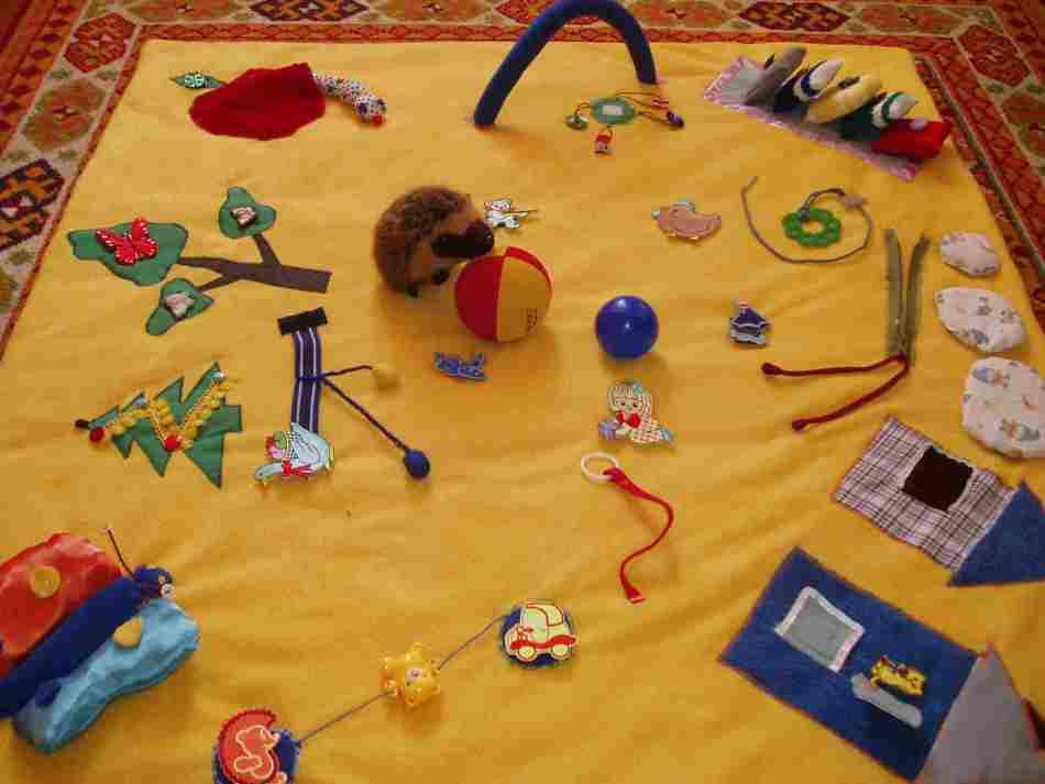Изделие должно быть ярким, красочным и содержать много цветных предметов. Его размер не стоит делать меньше метра на метр. Необходимо продумать тематику либо разделить коврик на секции с разными темами. Это подтолкнёт ребёнка к логическим размышлениям. Большое разнообразие игрушек позволит малышу быстрее и лучше развиваться. Игрушки могут быть разных размеров и из разного материала, чтобы ребёнку было интересно изучать их. Их необходимо крепко прикреплять к ткани. Время от времени экспозицию можно менять