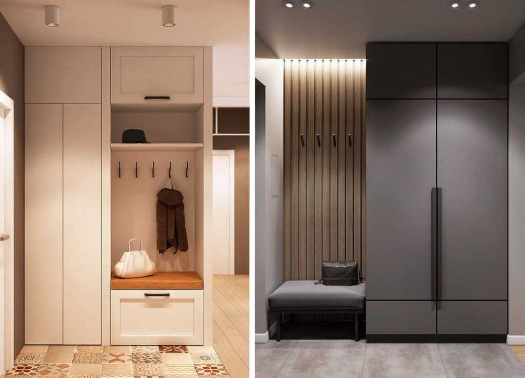 В маленькой узкой прихожей, системы хранения для одежды уместно расположить с боку от входной двери. При достаточном количестве бокового пространства, место вдоль одной стены можно обставить небольшим шкафом-купе с зеркальным фасадом или другой модульной мебелью. Возле параллельной стенки прекрасно разместится подвесная вешалка с обувной тумбочкой, компактный комод или стеллаж.