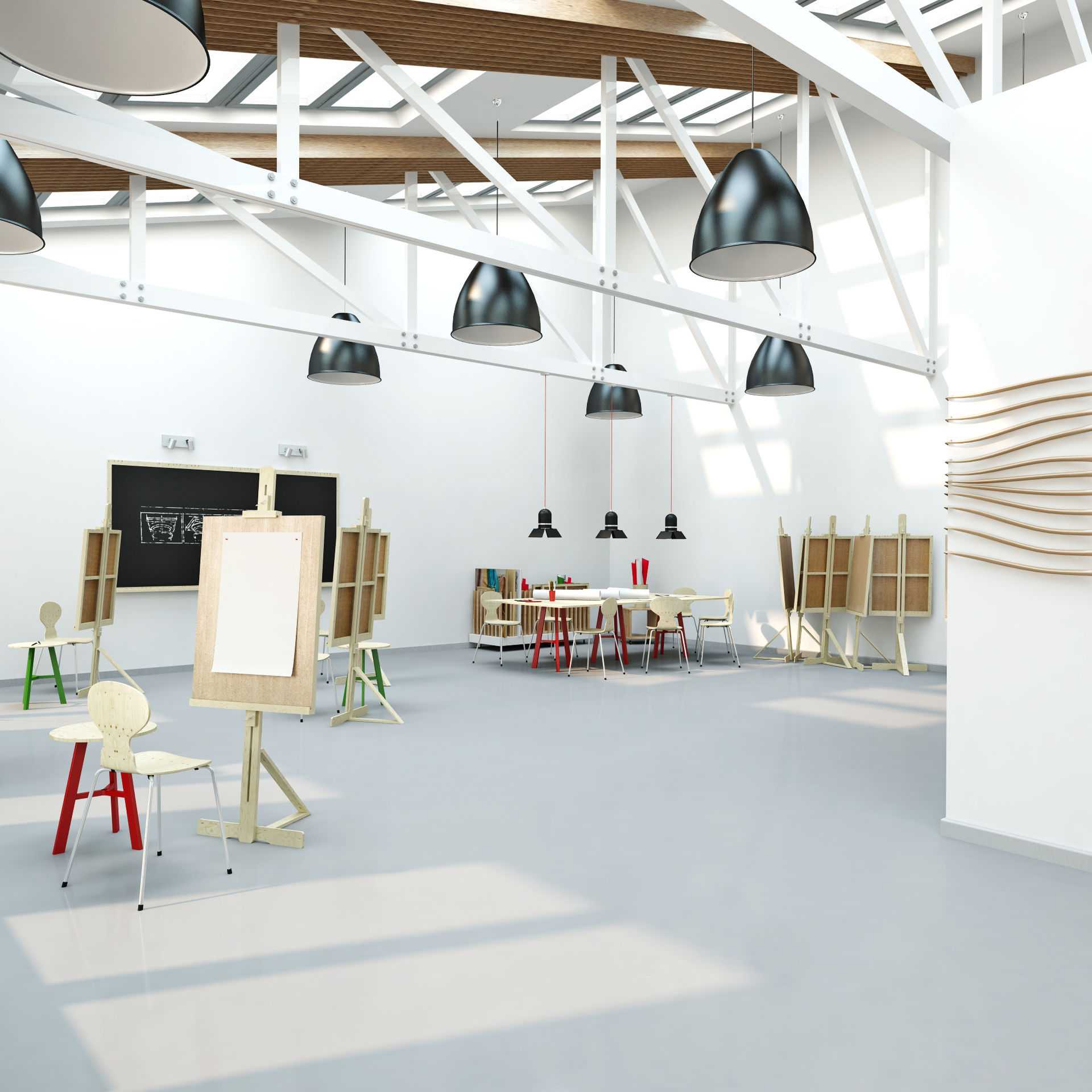 Классическим напольным покрытием для производственного помещения является бетон. Если простой бетонный пол покажется вам слишком холодным и непрактичным, то можно заменить его на: