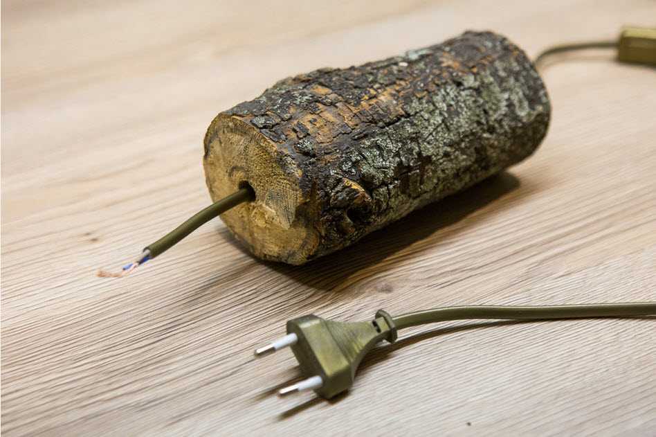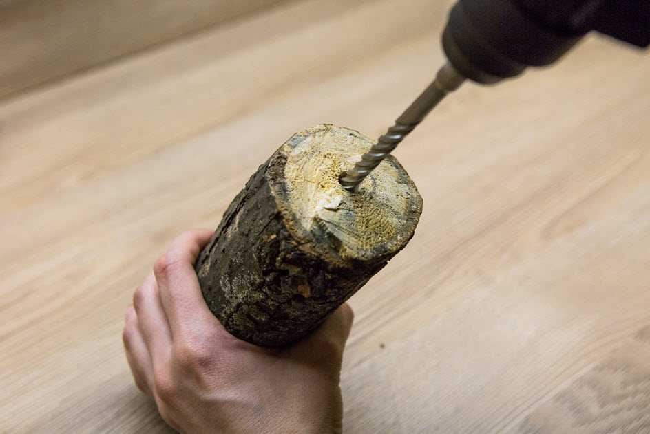 Укоротите корягу до нужной величины. По сути, светильник может быть любых форм и размеров, но, скорее всего, величина будет равно двойной длине вашего сверла. Просверлите сквозное отверстие чуть шире, чем диаметр вашего провода.